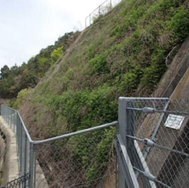 - 当該現場は当初施工されていた枠内植生基材吹付工の防草対策として、法尻より2枠ほど剥ぎ取り、本工法にて施工しました。